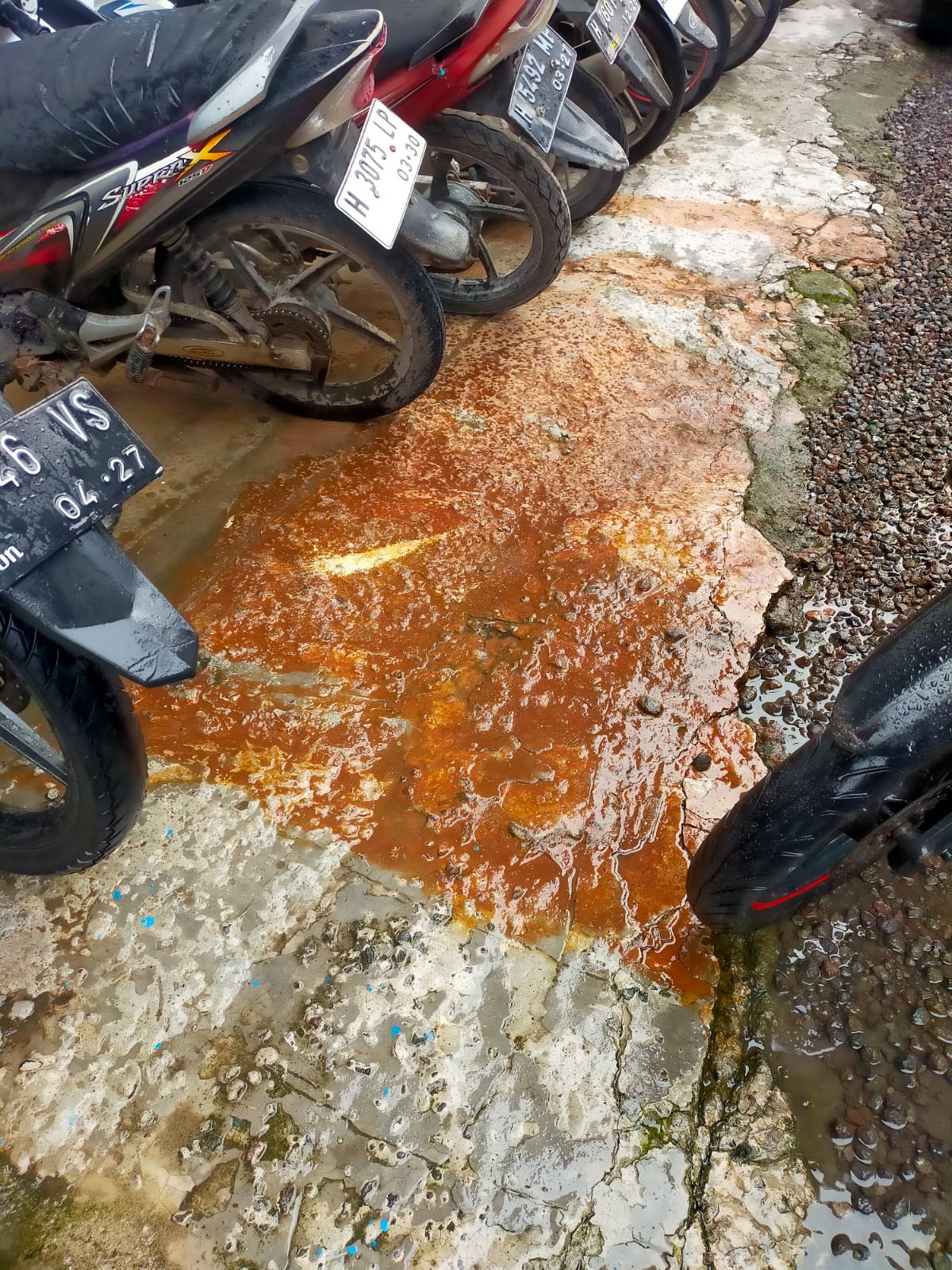 Akibat pembuangan limbah yang diduga dilakukan secara sembarangan, sejumlah titik di sekitar lokasi mengalami korosi parah pada permukaan logam dan beton yang terpapar.